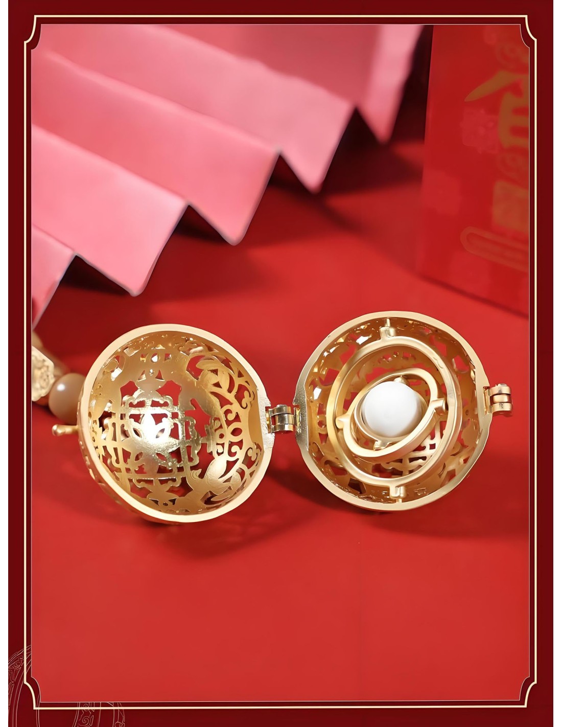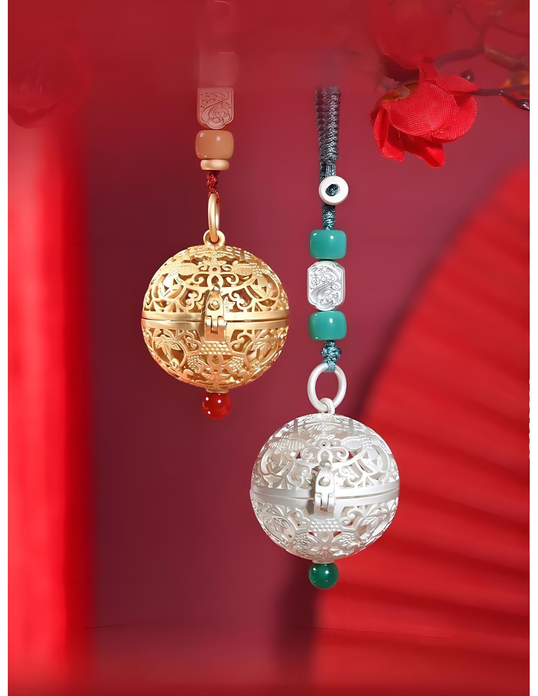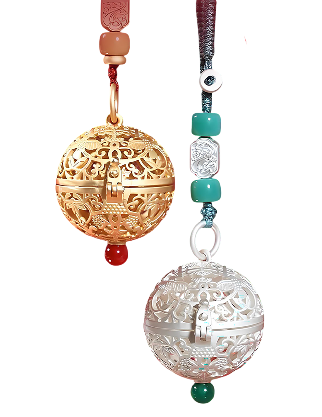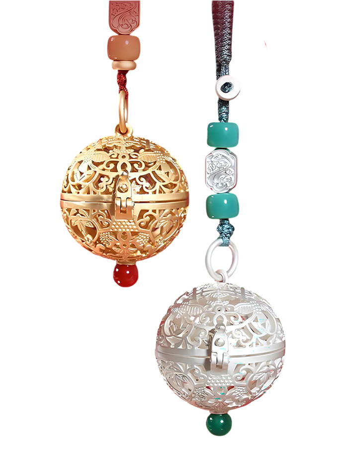 Im Inneren befindet sich ein antikes Duftsystem: Zwei konzentrische, rotierende Ringe halten einen kleinen goldenen Räucherkelch, der den natürlichen Duft sicher bewahrt – egal wie der Anhänger bewegt wird. Jeder Anhänger enthält drei aromatische Kugeln aus pflanzlichen Gewürzen, die einen sanften, beruhigenden Duft verströmen. Ob als Taschenanhänger, Auto-Dekoration oder tragbares Accessoire – dieser Duftanhänger bringt Stil und Geschichte in den Alltag.