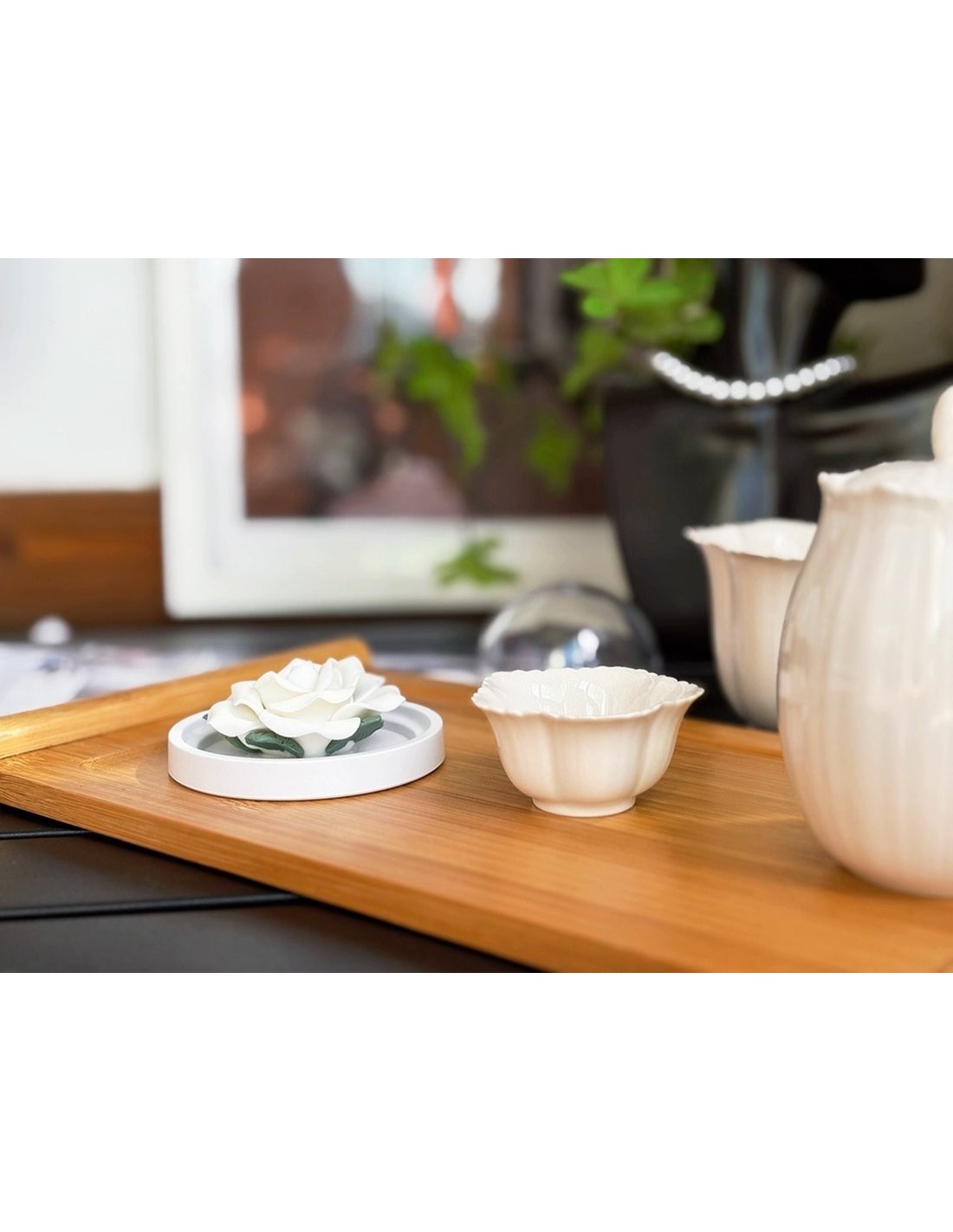Realizzato a Dehua, capitale mondiale della ceramica in Cina, questo porta-incenso in ceramica a forma di rosa bianca unisce eleganza e funzionalità. Include una confezione di bastoncini di incenso al sandalo, perfetto per profumare delicatamente ambienti come soggiorno, camera da letto o ufficio, e per decorare con stile.