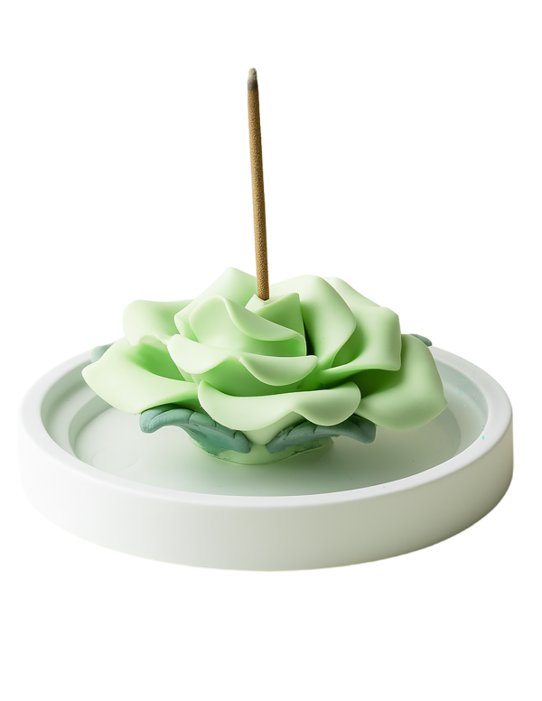 中国の陶磁器の都・徳化で作られた緑色の薔薇型陶器製お香立て。繊細で美しい造形は、線香のホルダーとしてだけでなく、リビングや寝室、オフィスのインテリアにも最適。天然白檀の線香付きで、香りと癒しを届けます。